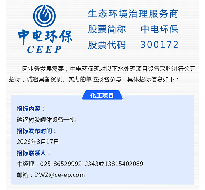 中電環(huán)保股份有限公司是南京市首家環(huán)保上市公司(股票簡(jiǎn)稱:中電環(huán)保,股票代碼:300172),南京環(huán)保產(chǎn)業(yè)協(xié)會(huì)會(huì)長(zhǎng)單位,國(guó)家級(jí)聯(lián)盟理事長(zhǎng)單位,是生態(tài)環(huán)境治理服務(wù)商,主營(yíng)(3+1):水務(wù)、固危廢、煙氣治理及產(chǎn)業(yè)創(chuàng)新平臺(tái),包括:工業(yè)水處理、污水處理及水環(huán)境綜合治理;固危廢土壤、污泥餐廚垃圾處理;煙氣及VOCS治理;智慧環(huán)保;高端裝備等。